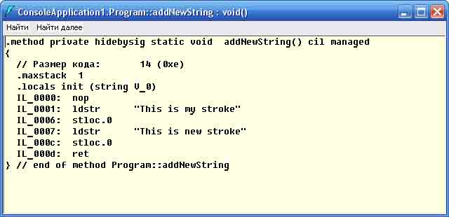 Скомпилируем приложение и загрузим результирующую сборку в утилиту ildasm.exe. На рисунке показан CIL-код, который будет сгенерирован для метода void addNewString():