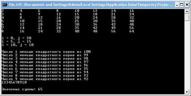 Обратите внимание на то, что эти три основные части оператора цикла for должны быть разделены точкой с запятой. Выполнение цикла for будет продолжаться до тех пор, пока проверка условия дает истинный результат. Как только эта проверка даст ложный результат, цикл завершится, а выполнение программы будет продолжено с оператора, следующего после цикла for.