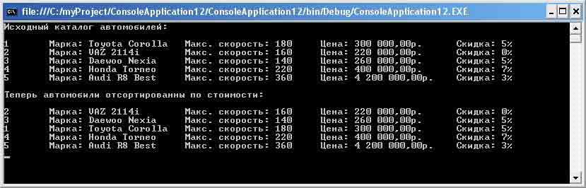 Console.WriteLine("nТеперь автомобили отсортированны по стоимости: n");