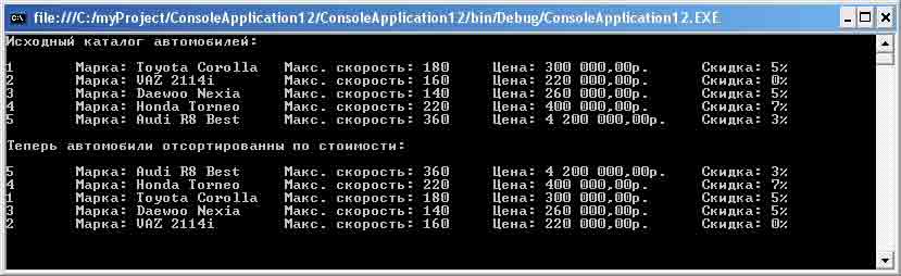 Console.WriteLine("nТеперь автомобили отсортированны по стоимости: n");