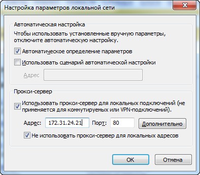 В данном случае Web-прокси-сервер имеет IP-адрес 172.31.24.21 и слушает порт 80. Этот прокси-сервер не должен использоваться для Web-серверов в интрасети. Через кнопку “Дополнительно” можно сконфигурировать разные прокси-серверы для разных протоколов (HTTP, HTTPS или FTP) и выбрать конкретные Web-сайты, к которым прокси-сервер не должен обращаться.