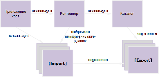 MEF состоит из частей и контейнеров, как показано на рисунке. Контейнер находит части в каталоге. Каталог находит части внутри сборки или папки. Контейнер подключает импорты к экспортам и таким образом делает части доступными приложению-хосту: