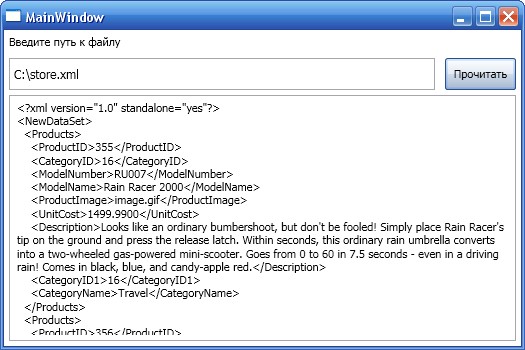 Рассмотрим пример чтения файла, создав приложение WPF, которое содержит обычное текстовое поле, кнопку и многострочное текстовое поле. В конечном итоге должна получиться форма, подобная показанной ниже. Используйте следующую разметку: