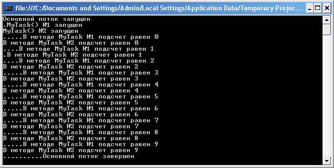 Следует иметь в виду, что по умолчанию задача исполняется в фоновом потоке. Следовательно, при завершении создающего потока завершается и сама задача. Именно поэтому в рассматриваемой здесь программе метод Thread.Sleep() использован для сохранения активным основного потока до тех пор, пока не завершится выполнение метода MyTask(). Как и следовало ожидать, организовать ожидание завершения задачи можно и более совершенными способами.