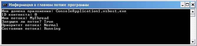 Вспомните, что точка входа исполняемой сборки (т.е. метод Main()) запускается в первичном потоке выполнения. Чтобы проиллюстрировать базовое применение типа Thread, предположим, что имеется новое консольное приложение. Как известно, статическое свойство Thread.CurrentThread извлекает объект Thread, представляющий текущий выполняющийся поток. После получения текущего потока можно вывести разнообразную статистику о нем: