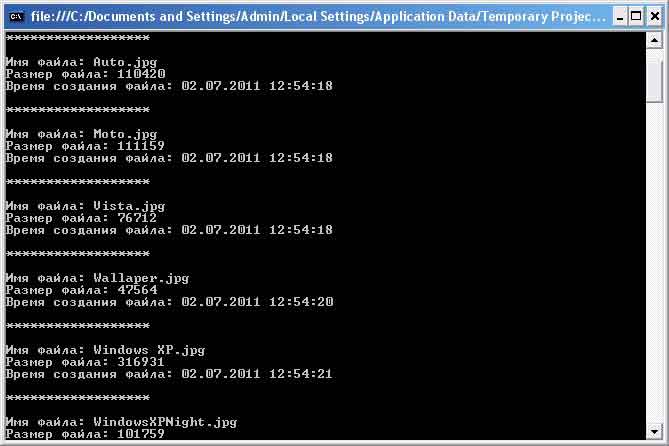Метод GetFiles() возвращает массив объектов типа FileInfo, каждый из которых представляет детальную информацию о конкретном файле. Предположим, что следующий статический метод класса Program вызывается в методе Main():