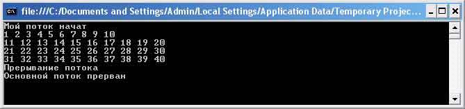 Кроме того, в самых редких случаях методу Abort() вообще не удается остановить поток. Это происходит, например, в том случае, если кодовый блок finally входит в бесконечный цикл. В приведенном ниже примере программы демонстрируется применение метода Abort() для прерывания потока: