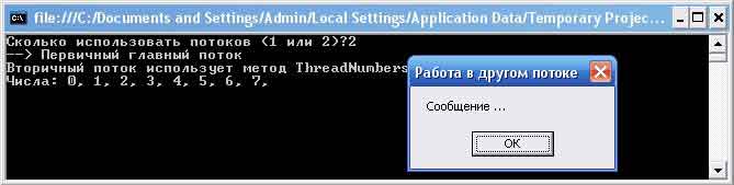 Если теперь запустить эту программу в одном потоке, обнаружится, что финальное окно сообщения не отображает сообщения, пока вся последовательность чисел не будет выведена на консоль. Поскольку после вывода каждого числа установлена пауза примерно в 2 секунды, это создаст не слишком приятное впечатление у пользователя. Однако в случае выбора двух потоков окно сообщения отображается немедленно, поскольку для вывода чисел на консоль выделен отдельный уникальный объект Thread: