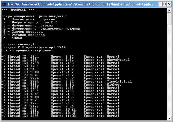 Данное приложение является многофункциональным и позволяет просмотреть все текущие процессы на машине пользователя, найти процесс по PID-идентификатору, получить информацию о потоках и подключаемых модулях процесса, а также запустить или остановить процесс (в качестве примера запуска процесса приведен запуск браузера Google Chrome и передача ему URL professorweb.ru).