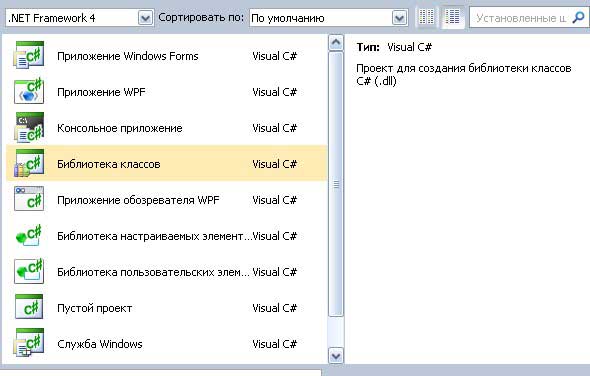 Для построения библиотеки кода в Visual Studio 2010 необходимо создать проект типа Class Library (Библиотека классов), выбрав в меню File (Файл) пункт New Project (Новый проект), как показано на рисунке: