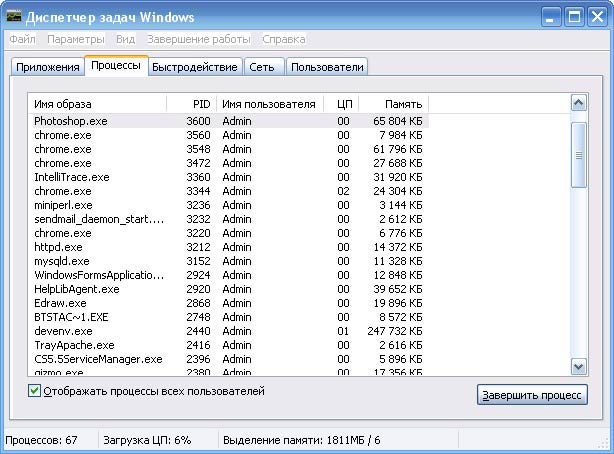 Каждый процесс Windows получает уникальный идентификатор процесса (Process ID — PID) и может независимо загружаться и выгружаться операционной системой (в том числе программно). Как уже наверняка известно, в окне WindowsTask Manager (Диспетчер задач) имеется вкладка Processes (Процессы), на которой можно просматривать различные статические данные о выполняющихся на данной машине процессах, в том числе их PID-идентификаторы и имена образов. Чтобы открыть окно диспетчера задач, нажмите комбинацию клавиш <Ctrl+Shift+Esc>: