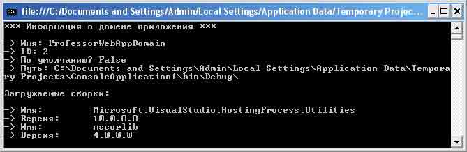 Запустив отладку данного проекта (нажатием <F5>), можно увидеть, что в каждый из доменов приложений будет загружаться много дополнительных сборок, которые необходимы Visual Studio для поддержки процесса отладки. Если просто запустить проект на выполнение (нажатием <Ctrl+F5>), будут выводиться только сборки, загруженные в каждый домен приложения.