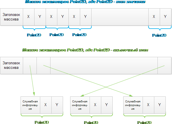 Существует еще один недостаток ссылочных типов, в сравнении с типами значениями. Если необходимо будет выполнить обход элементов такого огромного массива точек, для компилятора и аппаратной части компьютера проще будет обеспечить доступ к смежным ячейкам памяти с объектами Point2D, чем доступ через ссылки к объектам в динамической памяти, которые необязательно будут располагаться подряд. Как будет показано позже, эффективное использование кеша процессора может поднять производительность приложения на порядок.