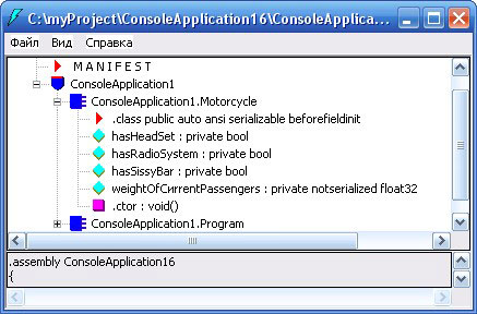 После компиляции этого класса можно просмотреть дополнительные метаданные с помощью утилиты ildasm.ехе. При этом следует обратить внимание на то, что эти атрибуты будут сопровождаться маркером serializable (в строке с треугольником красного цвета внутри класса Motorcycle) и маркером notserialized (в строке, представляющей поле weightOfCurrentPassengers), как показано на рисунке: