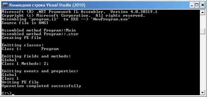 Чтобы скомпилировать измененный файл Program.il в новую .NET-сборку *.exe, необходимо ввести в окне командной строки Visual Studio 2010 следующую команду: