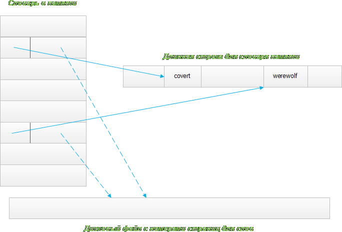 Массивы типов значений состоят исключительно из экземпляров этих типов. Однако каждый экземпляр содержит ссылку на строку; для n записей эти ссылки, наряду со смещениями в дисковом файле, будут занимать 16n байт в 64-разрядной системе. Мало того, что сам словарь слов будет занимать немалый объем ценной памяти, так еще и каждое слово в словаре будет храниться как отдельная строка, что потребует дополнительно 24 байта (16 байт на заголовок объекта + 4 байта на длину строки + 4 байта для хранения количества символов во внутреннем буфере, выделяемом для строки).