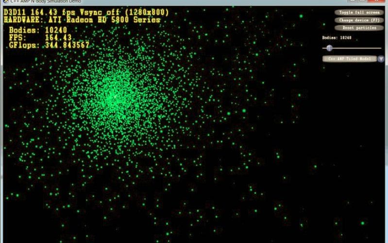 С привлечением соответствующего графического интерфейса, моделирование может оказаться очень интересным. Полный пример, представленный командой разработчиков C++ AMP, можно найти в блоге Native Concurrency. На моей системе с процессором Intel Core i7 и видеокартой Geforce GT 740M, моделирование движения 10 000 частиц выполняется со скоростью ~2.5 кадра в секунду (шагов в секунду) с использованием последовательной версии, выполняющейся на обычном процессоре, и 160 кадров в секунду с использованием оптимизированной версии, выполняющейся на графическом процессоре – огромное увеличение производительности.