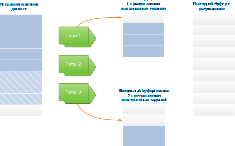 Серые прямоугольники представляют результаты завершенных заданий, помещенные в локальные очереди потоков, откуда они последовательно перемещаются в общий выходной буфер, доступный вызывающей программе. Заштрихованные прямоугольники представляют задания, выполняющиеся в данный момент.