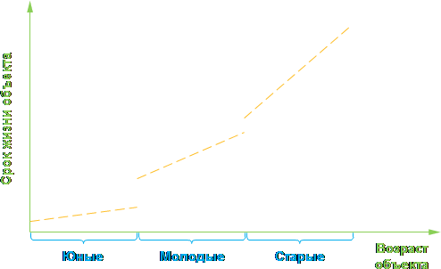 В отличие от мира животных, в .NET «юные» объекты «умирают» чаще, а «старые» – реже. Эти два предположения сделаны на основе распределения объектов по их возрасту и продолжительности жизни, как показано на рисунке ниже: