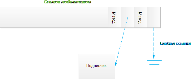 Ниже демонстрируется черновая версия реализации событий на основе слабых ссылок (как показано на рисунке). Само событие не может использовать механизм делегатов .NET непосредственно, потому что делегат хранит сильную ссылку на свою цель и это является мешающим обстоятельством. Однако, можно хранить цель делегата (в виде слабой ссылки). Такой подход позволяет избавиться от одной из наиболее типичных причин утечек памяти в .NET, когда по забывчивости события продолжают оставаться зарегистрированными!