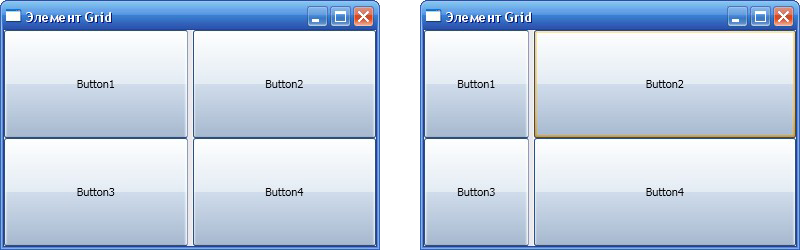 - GridSplitter всегда изменяет размер всей строки или колонки (вне отдельной ячейки). Чтобы сделать внешний вид GridSplitter соответствующим такому поведению, необходимо растянуть GridSplitter по всей строке или колонке, а не ограничиваться единственной ячейкой. Для этого используются свойства RowSpan и ColumnSpan.