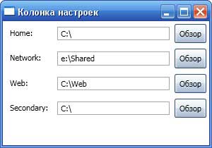 При наличии базовой структуры остается просто разместить элементы в правильных ячейках. Однако также потребуется тщательно продумать поля и выравнивание. Каждый элемент нуждается в базовом поле (подходящим значением для него будет 3 единицы), чтобы создать небольшой отступ от края окна. Вдобавок метка и текстовое поле должны быть центрированы по вертикали, потому что их высота меньше, чем у кнопки Обзор. И, наконец, текстовое поле должно использовать режим автоматической установки размера, растягиваясь для того, чтобы уместить всю колонку.