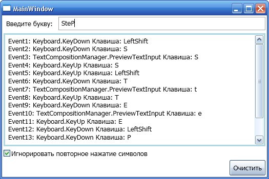 Этот пример демонстрирует один важный момент. События PreviewKeyDown и KeyDown возникают при каждом нажатии клавиши. Однако событие TextInput возникает только тогда, когда в элементе был “введен” символ. На самом деле это может означать нажатие многих клавиш. В примере, нужно нажать две клавиши, чтобы получить заглавную букву S: сначала клавишу <Shift>, а затем клавишу <S>. В результате получаются по два события KeyDown и KeyUp, но только одно событие TextInput.