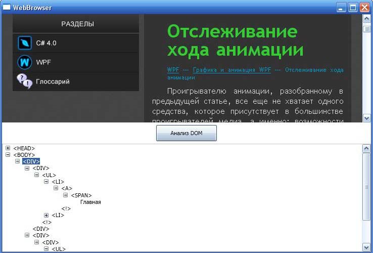 При использовании элемента управления WebBrowser допускается писать код C#, который позволяет проходить по дереву HTML-элементов на странице. Можно даже изменять, удалять или вставлять элементы с помощью программной модели, подобной HTML DOM, которая применяется в таких языках сценариев для веб-браузеров, как JavaScript.