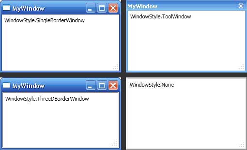 - Принимает значение перечисления WindowStyle, которое определяет внешний вид границы окна. Возможные значения: SingleBorderWindow (по умолчанию), ThreeDBorderWindow (граница визуализируется несколько иным образом в Windows ХР), ToolWindow (отображается тонкая граница, удобная для “плавающих” окон с инструментами без кнопок сворачивания и разворачивания) и None (визуализируется очень тонкая приподнятая граница без области для строки заголовка). Увидеть разницу можно на рисунке ниже: