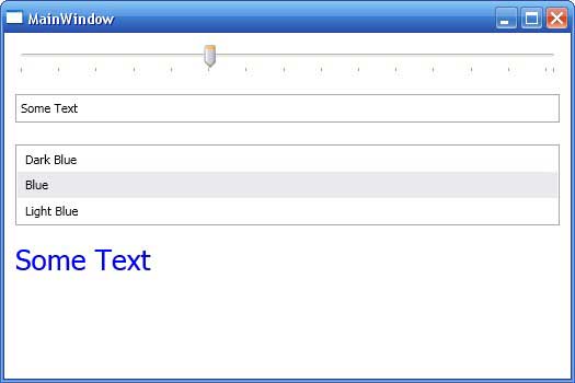 Чтобы понять, как это работает, рассмотрим вариацию примера элемента — панели с ползунком, который включает текстовое поле, куда можно поместить точное значение размера шрифта. В этом примере свойство TextBlock.FontSize может быть установлено двумя путями: перетаскиванием ползунка или вводом в текстовом поле размера шрифта. Все элементы управления синхронизированы так, что если вводится новое число в текстовом поле, размер шрифта текста примера изменяется и ползунок перемещается в соответствующую позицию.