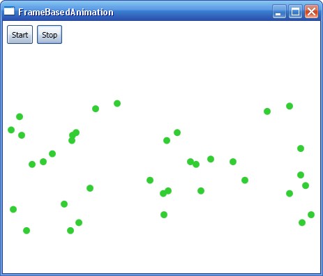 Наряду с системой анимации, основанной на изменении свойств, WPF предоставляет способ создания анимации на основе кадра, не используя ничего помимо кода. Все, что понадобится — реагировать на событие CompositionTarget.Rendering, которое возбуждается для получения содержимого каждого кадра. Это довольно низкоуровневый подход, который стоит применять только в том случае, когда выясняется, что стандартная модель анимации на основе изменения свойств не подходит для реализации существующего сценария (например, при построении простой игры с прокруткой экрана, создании анимации на основе физических законов либо моделировании таких эффектов, как огонь, снег или пузыри).