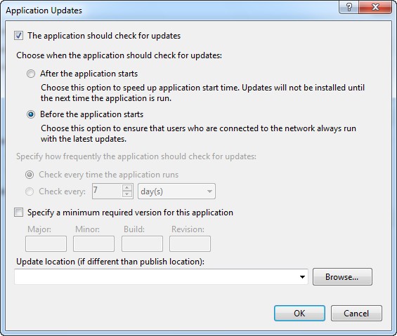 Можно также указать необходимую минимальную версию. Это можно использовать для того, чтобы сделать обновления обязательными. Например, если установить версию публикации 1.5.0.1 и минимальную версию 1.5.0.0, а затем опубликовать приложение, то любой пользователь, располагающий версией старше 1.5.0.0, будет вынужден выполнить обновление, прежде чем сможет запустить приложение (по умолчанию минимальная версия не устанавливается и все обновления необязательны).