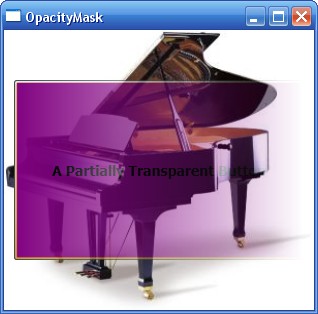 Свойство Opacity делает все содержимое элемента частично прозрачным. Свойство OpacityMask обеспечивает большую гибкость. Его можно использовать для того, чтобы сделать определенную область элемента прозрачной полностью или частично. OpacityMask позволяет достичь широкого разнообразия распространенных и экзотических эффектов. Например, с его помощью можно обеспечить плавное нарастание прозрачности фигуры.