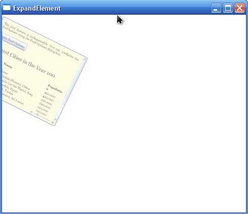 Ниже показан интересный эффект, полученный в результате использования двух трансформаций. Окно документа начинается с маленькой пиктограммы в левом верхнем углу окна. Когда окно появляется, это содержимое вращается, расширяется и быстро становится видимым. Это концептуально подобно эффекту, используемому Windows при развертывании окна. В WPF можно задействовать этот трюк в любых элементах, применяющих трансформацию.