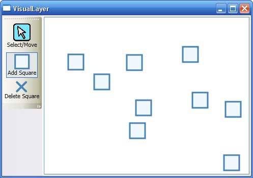 По этой причине принято создавать выделенный пользовательский класс, служащий оболочкой для визуальных объектов, которые необходимо отобразить. Например, рассмотрим окно, показанное на рисунке. Оно позволяет пользователю добавлять квадраты (каждый из которых является визуальным объектом) в специальный контейнер Canvas: