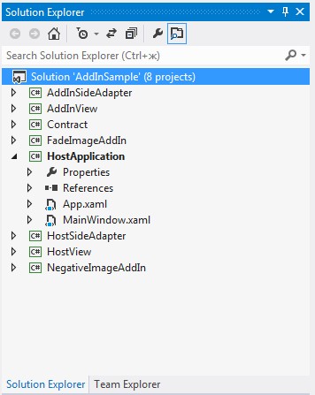 3. Добавьте новый проект библиотеки классов для каждого компонента конвейера и поместите их все в одно и то же решение. Как минимум, понадобится создать проект для одного дополнения (например, c:AddInTestFadeImageAddIn), одного представления дополнения (c:AddInTestAddInView), одного адаптера стороны дополнения (c:AddInTestAddInSideAdapter), одного представления хоста (c:AddInTestHostView) и одного адаптера стороны хоста (c:AddInTestHostSideAdapter). На рисунке ниже показан пример решения, которое включает приложение (под названием HostApplication) и два дополнения (с именами FadeImageAddIn и NegativeImageAddIn):