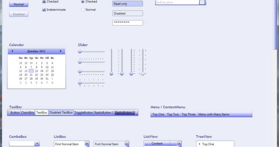 Примеры шаблонов элементов управления включает простые шаблоны для всех стандартных элементов управления WPF, что предоставляет отличную начальную точку для проектирования любого специального элемента управления. В отличие от шаблонов элементов управления по умолчанию, примеры шаблонов используют стандартные цвета, выполняют всю работу декларативно (без классов Chrome) и обходятся без дополнительных частей, таких как привязки шаблонов для редко используемых свойств.