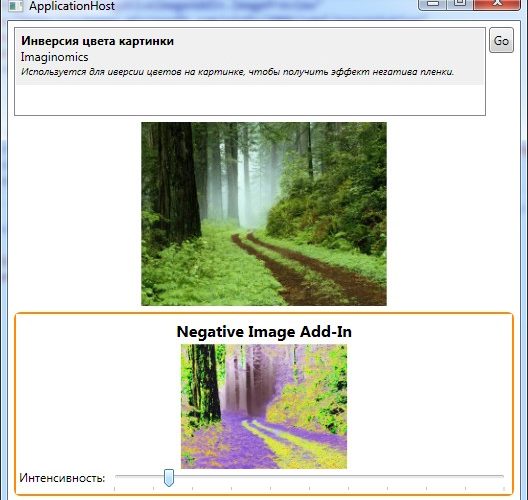 В этом примере выбрано дополнение, превращающее изображение в негатив. Оно представляет пользовательский элемент управления, который упаковывает элемент Image (с предварительным просмотром эффекта) и элемент Slider. По мере перемещения ползунка Slider меняется интенсивность эффекта, и изображение предварительного просмотра изменяется. (Процесс обновления довольно медлительный по причине плохой оптимизации кода обработки изображения. Для достижения максимальной производительности можно было бы воспользоваться гораздо более совершенным алгоритмами, возможно, включающими небезопасные блоки кода.)