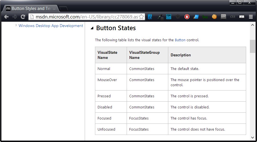Состояния объединены в группы. Каждая группа содержит взаимно исключающие состояния, т.е. элемент управления может находиться только в одном из состояний группы. Например, для кнопки определены две группы: CommonStates и FocusStates. В каждый момент времени кнопка может находиться в одном из состояний группы CommonStates и в одном из состояний группы FocusStates.