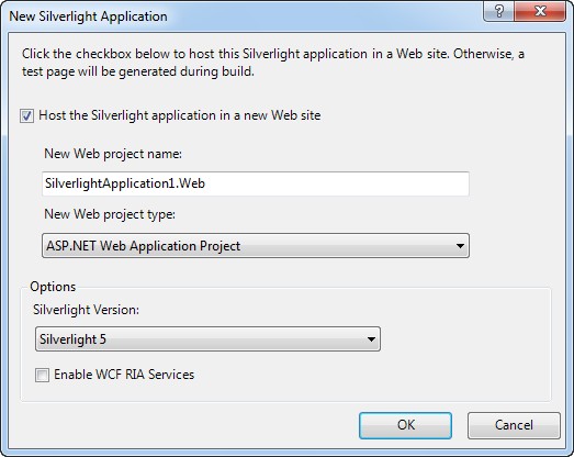 4. Убедитесь в том, что установлен флажок Host the Silverlight application in a new Web site (Хостировать приложение Silverlight на новом веб-сайте).