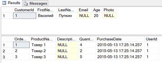 Запустите наш пример и откройте в браузере веб-форму CascadeDelete.aspx и щелкните по кнопке “Сохранить”. Entity Framework воссоздаст базу данных (если модель изменилась) и добавит новые данные в таблицы Customers и Orders. Чтобы в этом убедиться, используйте средства Visual Studio или SQL Server Management Studio для просмотра данных: