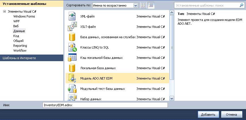 Выберите пункт меню Project –> Add New Item (Проект –> Добавить новый элемент) и вставьте новый элемент ADO.NET Entity Data Model по имени InventoryEDM.edmx: