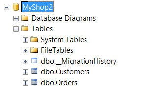 Запустите этот пример и убедитесь, что Code-First создаст новую базу данных с именем MyShop2 для текущей модели. Если вы прорабатывали примеры из предыдущих статей, то пока удалите вызов конструктора базового класса из класса контекста. В результате будет создана следующая база данных: