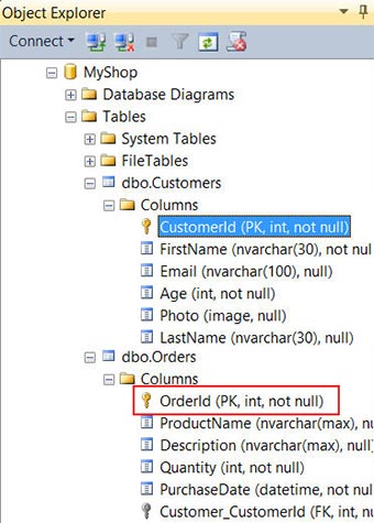 Entity Framework требует, чтобы каждый класс сущностной модели имел уникальный ключ (т.к. для каждой таблицы в реляционной базе данных должен использоваться первичный ключ). Этот ключ используется в объекте контекста, для отслеживания изменений в объектах модели. Code-First делает некоторые предположения, при поиске ключа в таблице. Например, когда мы сгенерировали базу данных для классов сущностей Customer и Order ранее, при рассмотрении подхода Code-First, то Entity Framework пометил поля CustomerId и OrderId в таблицах, как первичные ключи и задал для них поддержку не обнуляемых типов: