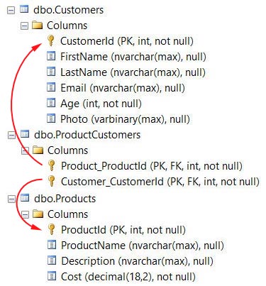 Если вы запустите приложение, то Entity Framework автоматически воссоздаст базу данных, т.к. модель изменилась. Code-First сможет распознать связь между этими классами как многие-ко-многим и создаст промежуточную таблицу, которая содержит внешние ключи, ссылающиеся на таблицы Customers и Products, как показано на рисунке ниже: