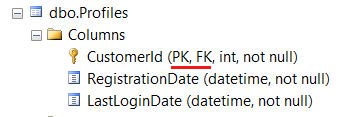 Если вы теперь запустите приложение, то Entity Framework корректно создаст таблицу Profiles. Как показано на рисунке ниже, ключ CustomerId является как первичным, так и внешним ключом для этой таблицы:
