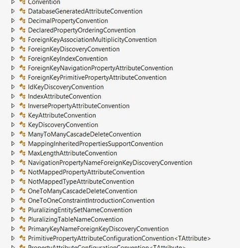 В предыдущих статьях мы видели, что Code-First следует некоторым соглашениям при проектировании базы данных из классов модели данных. Вы можете удалить одно или несколько соглашений из вашего приложения, используемых по умолчанию. Соглашения реализуется в виде классов, находящихся в пространстве имен System.Data.Entity.ModelConfiguration.Conventions. На рисунке ниже показан полный список соглашений, используемых в Code-First версии Entity Framework 6: