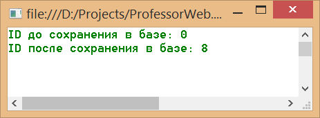 Обратите внимание на отображение нашего управляемого кода на этот SQL-запрос. Для вставки значений используются переменные @0, @1 и @2. Они инициализируются при компиляции приложения. Также, после инструкции INSERT следует инструкция SELECT, которая выбирает значение первичного ключа (в нашем случае CustomerId) для вновь вставленной записи. Благодаря этому, Entity Framework передает значение этого ключа переменной customer в коде. Т.е. после вставки данных, мы можем изменить или удалить этот объект, не извлекая его снова из базы. Чтобы убедиться, что EF инициализирует свойство первичного ключа в объекте модели при вставке в базу данных, можно изменить немного предыдущий пример:
