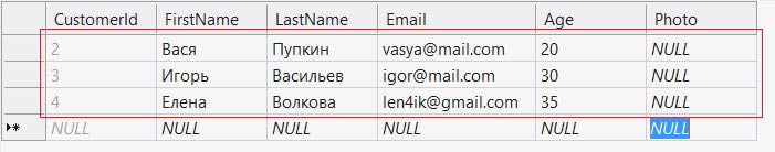 На рисунке ниже, для наглядности, показана та область таблицы Customers, данные которой извлекаются в этом примере: