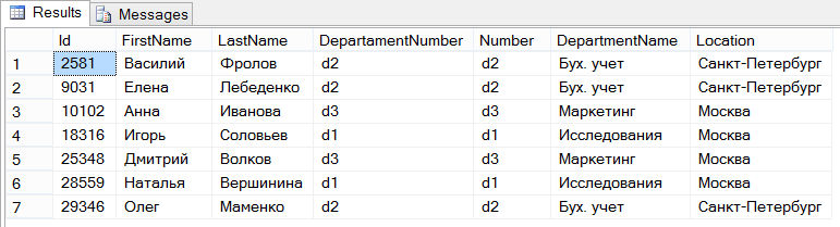 В этом примере в инструкции SELECT для выборки указаны все столбцы таблиц для сотрудника Employee и отдела Department. Предложение FROM инструкции SELECT определяет соединяемые таблицы, а также явно указывает тип операции соединения – INNER JOIN. Предложение ON является частью предложения FROM и указывает соединяемые столбцы в обеих таблицах. Выражение “Employee.DepartamentNumber = Department.Number” определяет условие соединения, а оба столбца условия называются столбцами соединения.